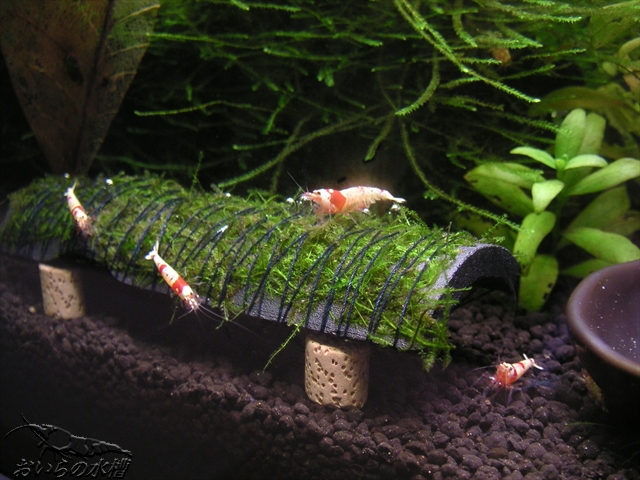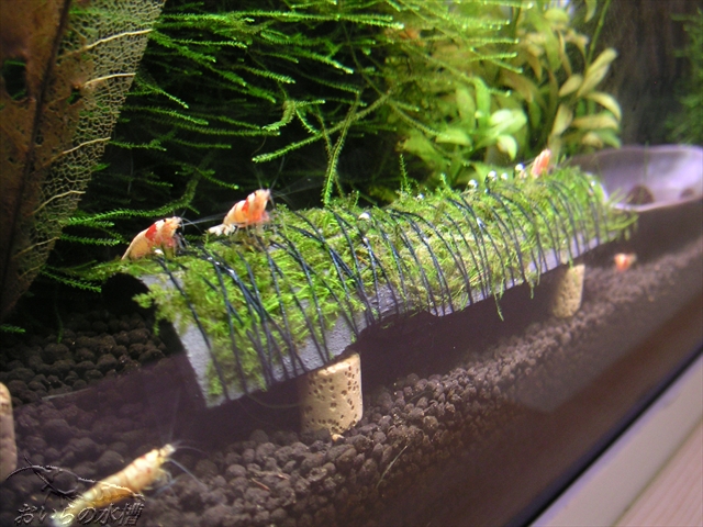 エビさん、喜んで食べることでしょう♪ 竹炭にウィローモス、私も巻いてました^^ 流木なんかに巻くより、平らで巻きやすいですよね。 モスも綺麗に育つといいですね♪