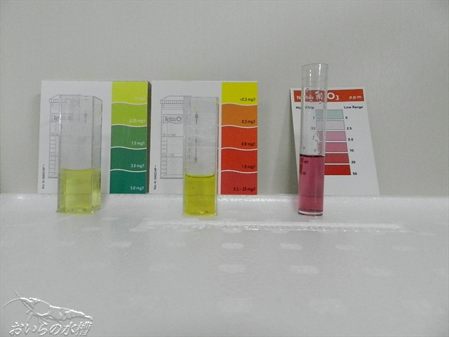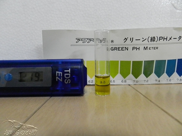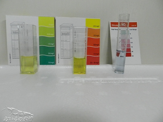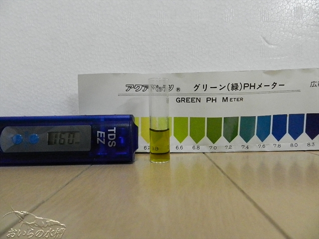 1.8/30 立ち上げ 2.30日程後 アンモニア・亜硝酸・硝酸塩検出 3.40日程後 アンモニア(若干)・亜硝酸・硝酸塩検出 (全水替したからか) 4.50日程後 アンモニア無し・亜硝酸無し・硝酸塩多 5.60日程後 エビさん投入(1週間で抱卵固体4~5匹程発見)←11/2 のような経過なのですが、エビさん投入時も硝酸塩の検出は多かったです。 「4」の時に前回記事にしたように、足し水や水替えに使用するポリタンク貯水に 活性炭を入れました。 それから、またまた考えて、水槽内には自作投げ込み式の活性炭フィルターを入れました。 ミニ五郎(焼酎:大五郎のワンカップ版220ml)の容器底面にエアレーション用の穴を開けて口の部分にスポンジを押し込みました。 これだと、水槽内の景観を極端に悪くする事は無かったです(私観的に)。 しかし一週間位後、中に一匹エビさんが入ってしまったので要改良です><; エアーが出るパイプ上部から進入したと思うので、エビさんが入らない位の エアー量にする必要があります。 6.90日程後の水質検査 こんな結果は見たことがありませんでした。 まずは、PHとTDSです。 ここまでは良いとして、次、行きます。 左から、アンモニア・亜硝酸・硝酸塩です。 今まで赤かった硝酸塩が、うっすらと緑に見えます。 2回計りましたが同じでした。 試薬が古くなって使い物にならない? と疑い、既に崩壊したと思われ、半年ほどエビさんは入れずに お魚さんと水草を入れている水槽を計ったところ、 PHとTDSはこちら 問題の硝酸塩は・・・・ 普通に検出されました。 新規水槽内に仕掛けた活性炭効果なのでしょうか。 それとも、私が無知で何か重要な事を見落としているのでしょうか・・・ 狐につままれている感じです><; 最後に近況のご報告です。 抱卵さんが4~5匹程。 昨日1匹ですが、1.3.mm位の稚えびちゃんを発見しました! しかし、今日は見つけられませんでしたorz ではではノシ PR この記事にコメントする