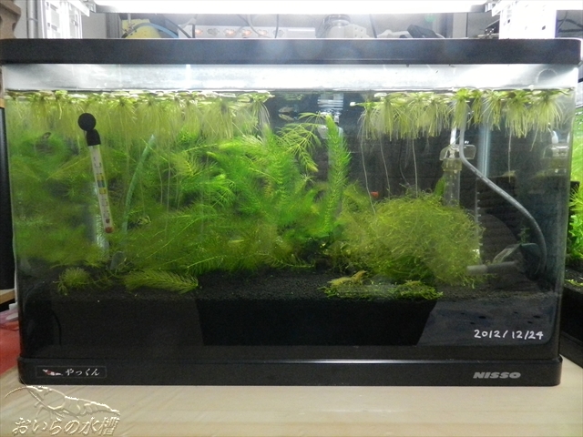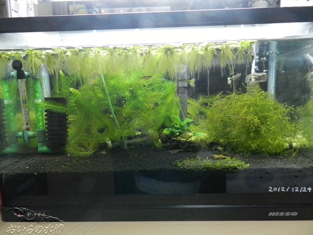 熱帯魚水槽に苔が付き始め、水がクリアーなのか、濁っているのか判断できなくなってきました><; 苔取り用スクレイパーは以前から色々な方のブログの記事で自作されているのは知っていたのですが、 (格好良いですよね!欲しいですよね!) おいらには、丸い棒に平らな板を取り付けるとか、台形の形を切り出す等、到底真似できる訳も無く諦めていましたorz そして、コケ水槽を見て見ぬ振りをしていたのですが、水槽の中が見えないのでは水質の感じが全く分りません><; そんな時、ある方のブログで自作スクレイパーの紹介がありました。 おいらがスクレーパーに求める事は3つ。 ・ガラス面のコケが取れること。 ・作業時に水槽内に手が入らないこと。 (水槽内にいらない雑菌が入る可能性を無くしたい) ・おいらでも、自作できそうな事。 この3つを満たせそうな記事が「YAMA=EBI」さまのブログで紹介されていました^^ こちらです! (YAMA=EBIさまのご了承を得て、記事にしています) そして、おいらもホームセンターに走り、部材を購入し、作りました。 我が家の水槽は水深36cmですので、持つ部分も入れて、長さは40cmにしました。 部材はアルミですがアルマイト加工品は高かったので、黒く塗装された物です。 塗装無しは売っていなかったので、まずは熱帯魚水槽で数ヶ月使用していれば、その内エビさん水槽で使おうかと^^; お尻の方に、普段フックに引っ掛けて乾燥&収納できるように穴を開けました。 アップで! YAMA=EBIさまのブログでも紹介されていますように、若干角度をつけた方が使いやすいです。 45度はつけすぎ。30度位が丁度よかったです。 アルミ板を曲げた際に黒い塗装が若干はげてしまいましたが、これはご愛嬌ですね><; 暖めてから作業すればこのような事にはならなかったかもしれません。 反対側からです。 右側のナットの一角が厚みが薄いのが分りますか? 素人ならではの、やっつけ仕事で、真ん中の棒がうまく収まらなかったので、ナットの一角をヤスリで削りました。 コケ掃除前の熱帯魚水槽です。 前面だけ、コケを落としました^^ 思っていたより、水は綺麗そうな感じです。 最後に、稚エビちゃんの写真を。 大人エビの、右下に小っちゃく^^ ではでは^^ノシ PR この記事にコメントする