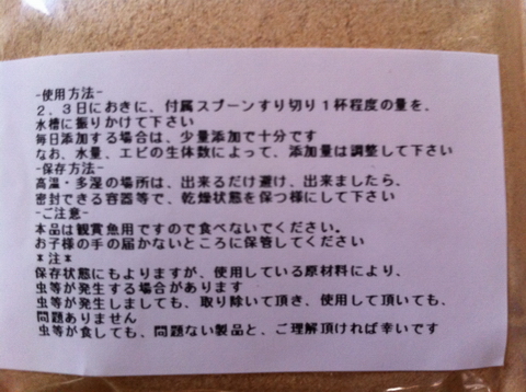 ありがとうございます 何処に貼ろうかな~^^考える前にまずはパシャ ![]() やはり、エビさん水槽には貼りたいですね~ と言う事で早速ペタッ ![]() ちょっと、照れますな ![]() ありがとうございました~! そして今日はもう一つ、届いたものがあります。先日注文した「シュリンプバクター」です ![]() 発注後、内容量の記載が無かった事に気づき、ショップに問い合わせた所、信じられない回答が ![]() ---------------------------- こちらの商品は特にメーカーからの内容量の記載がございません。 ---------------------------- こういう商売もあるのですね ![]() 気を取り直して、キッチンスケールで測った所、40gでした。 さてさて、能書きを読んでみましょう。 「虫等が食しても、問題ない製品と、ご理解頂ければ幸いです」ってw 師匠に教わったとおり、別容器に移して冷蔵庫に保管です。 今日は、もう一つネタがあります ![]() 昨日は力尽きて作業できなかった園芸です。 まずはプランターの底に軽く軽石を敷いて、野菜用の土をドバっと入れました。水をたっぷりかけて、種を植えたらこんな感じになりました ![]() 無農薬で栽培しますので、虫除け用のネットが必要になります。まずは骨組みを組んで。クルーガン、使ってみましたが、初めて使うので要領がつかめず、慣れてきた頃には作業は終わってしまいました ![]() あとはネットを被せて、はい!完成 ![]() ではでは^^ノシ PR この記事にコメントする