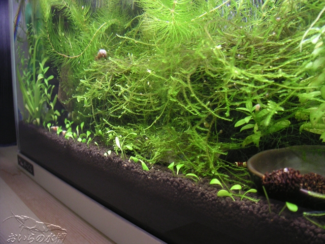 ![]() ん~、このジレンマどうしよう ![]() 200hiace師匠に無理を言って、エビさんをお売り頂きましたm(_ _)m 師匠、無理を聞いて頂き、ありがとうございました ![]() エビさんが入った水槽を ![]() 御行儀よく並んでいたので、またまた ![]() 足場に入れて頂いた水草は3種類あったのですが、ウィローモス以外の2種類は知らない水草でした。 まずはこちら。 奥の方にモヤモヤと有るのがお分かりになりますでしょうか。 (中央に写っている明かりは部屋の反対側に置いてある60cmスリム水槽です) さてさて、「なんて言う水草ですか?」と質問した所、「ニテラ」とのご返事。 ニテラ? おいらさっぱり知らなかったのですがgoogleで調べた所、なんと 近頃ではあまり入手しづらい水草との事。師匠、粋です![]() おいらの水槽で増えますように^^ ちょこっとアップで ![]() もう一つは、「グロッソスティグマ」との事。 Co2添加と、強い光が必要との事 ![]() Co2添加は今は用意できませんが、少しでも生き延びて頂こうと、照明と底床までの距離が短いスリム水槽に植えました。ランナーを切って一株づつに分けて水槽の前面に植え込みました。何とか生き延びてね~の ![]() 別の角度からもう一枚 ![]() 早速、グロッソスティグマ畑にお客様が(嬉 今度こそは安定飼育が出来ますように ![]() ではでは^^ノシ PR この記事にコメントする
